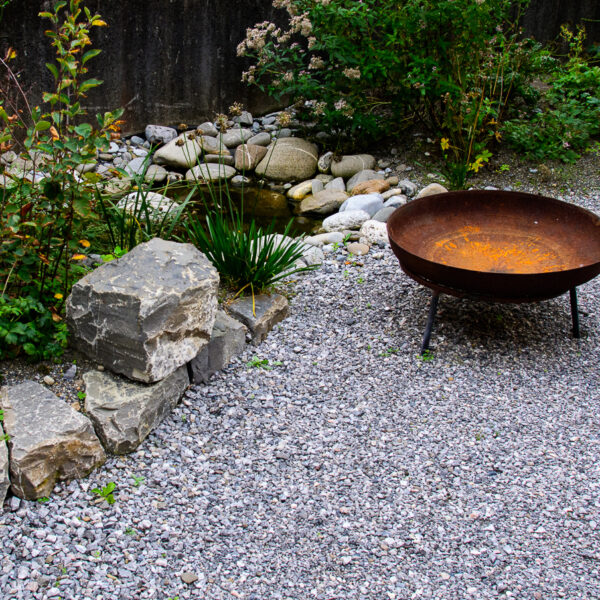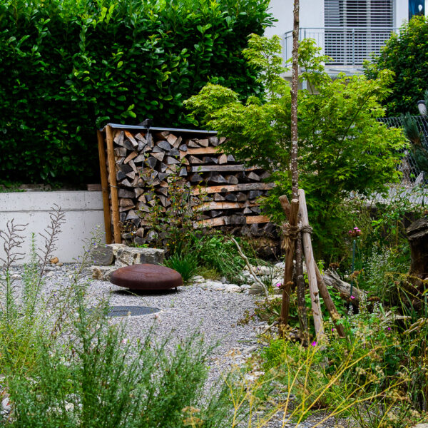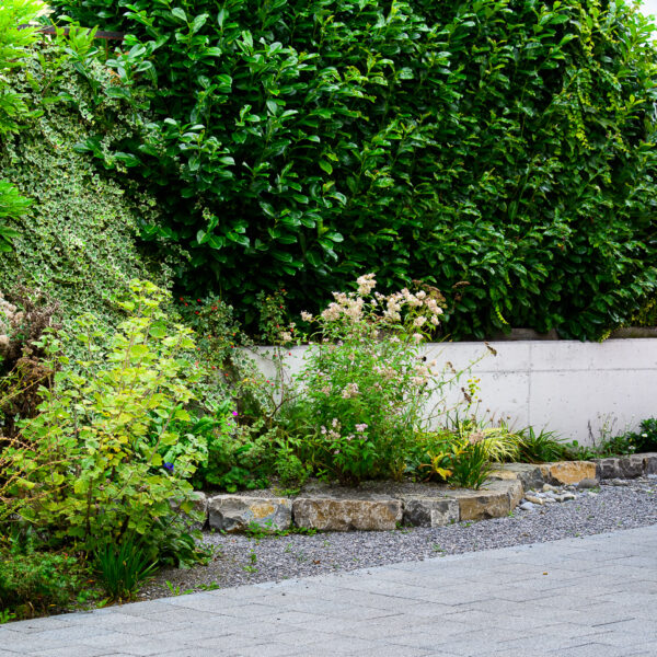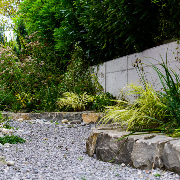 Besondere Merkmale dieses Projekts sind die Natursteinmauern, die nicht nur funktional sind, sondern auch als Blickfang dienen. Die Nutzung von feinen Kiessteinen schafft einen angenehmen Weg durch den Garten, der von einer üppigen Bepflanzung umrahmt wird. Zu den verwendeten Pflanzen gehören Lavendel, Rosmarin, Gräser und Stauden, die den Garten mit Farbe, Struktur und Duft bereichern. Verschiedene Sträucher und kleine Bäume tragen dazu bei, eine naturnahe Atmosphäre zu schaffen.