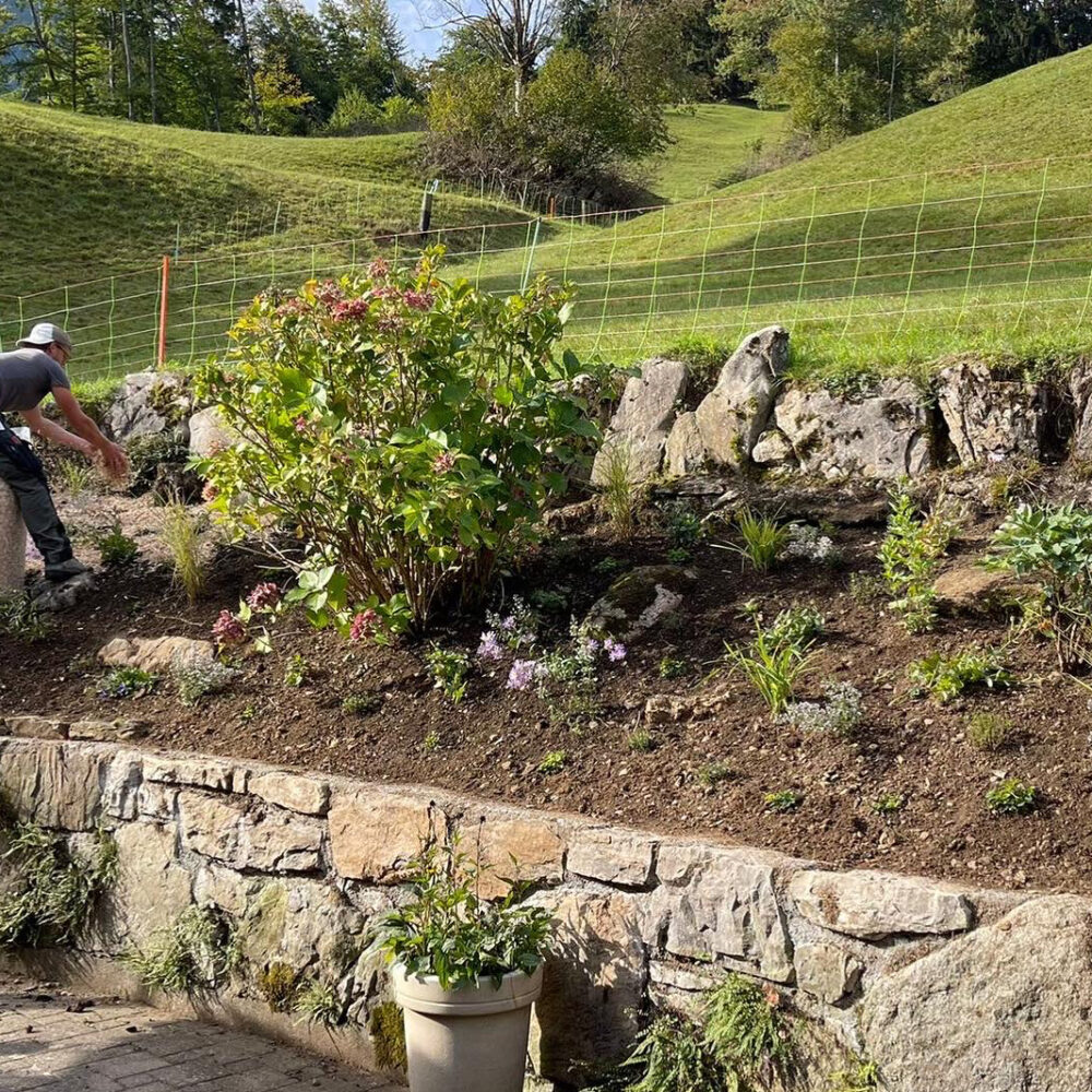 In Wilderswil beauftragten die Kunden die Gartenhelden mit der kompletten Neubepflanzung der Rabatten hinter dem Haus. Insgesamt wurden 450 Blumenzwiebeln und 200 Stauden unterschiedlicher Arten eingesetzt, die für eine ganzjährige Blütenpracht sorgen. Die Auswahl der Pflanzen wurde so getroffen, dass der Garten von Frühling bis Herbst in voller Blüte steht – mit einer Mischung aus Farbtönen und Texturen, die den Garten das ganze Jahr über lebendig machen.